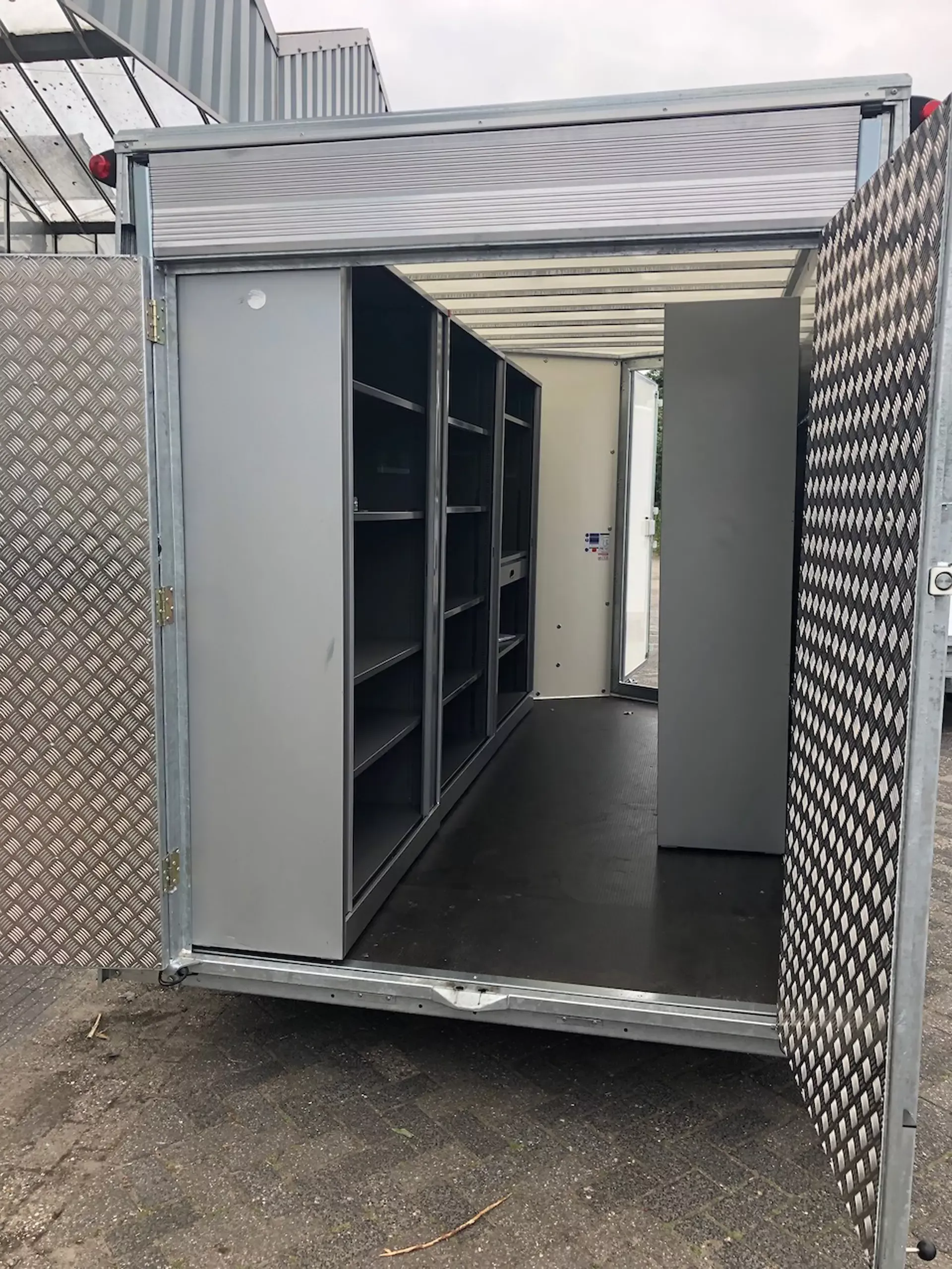 Achterzijde open met klep om ladders te laden en lossen. Deze komen boven de kasten.